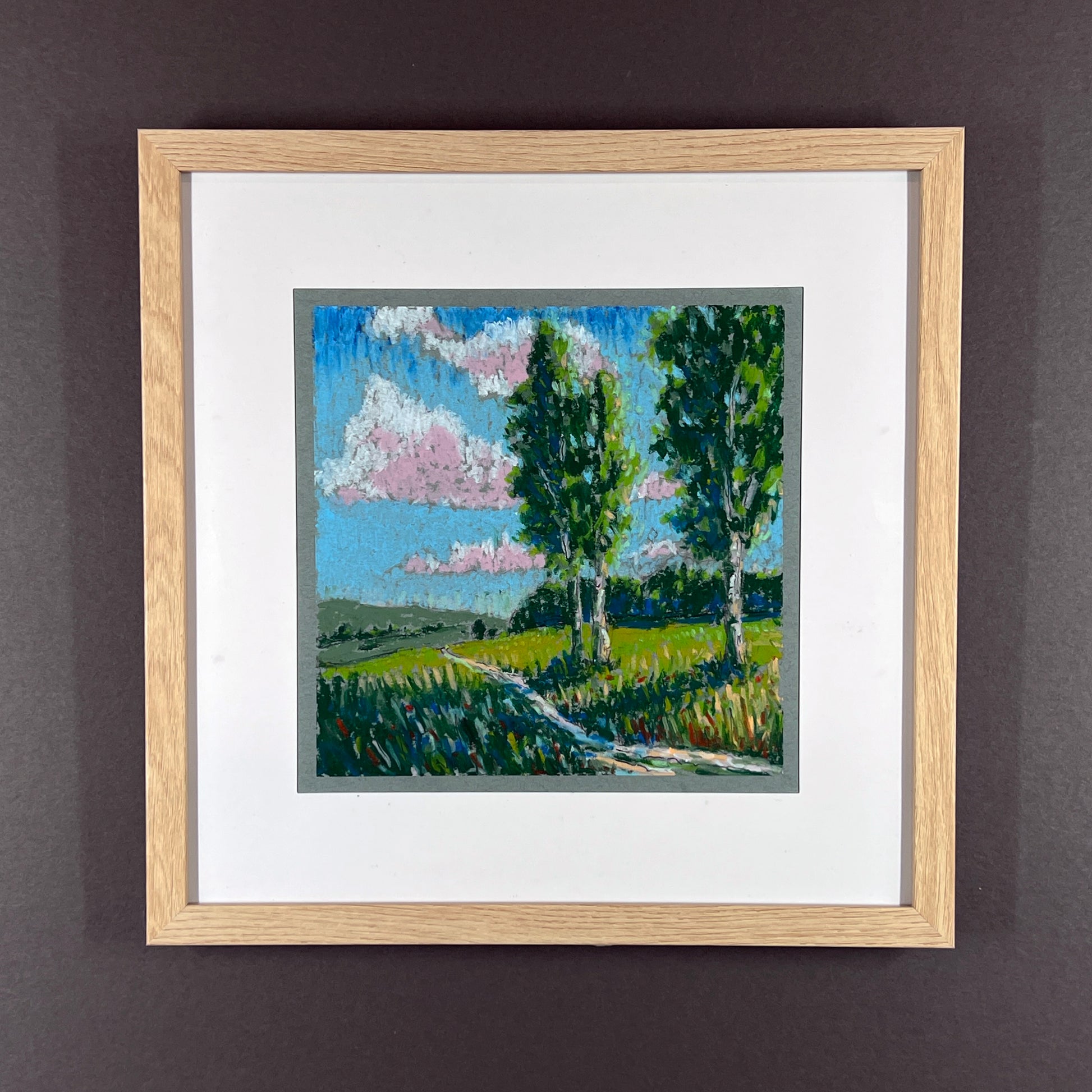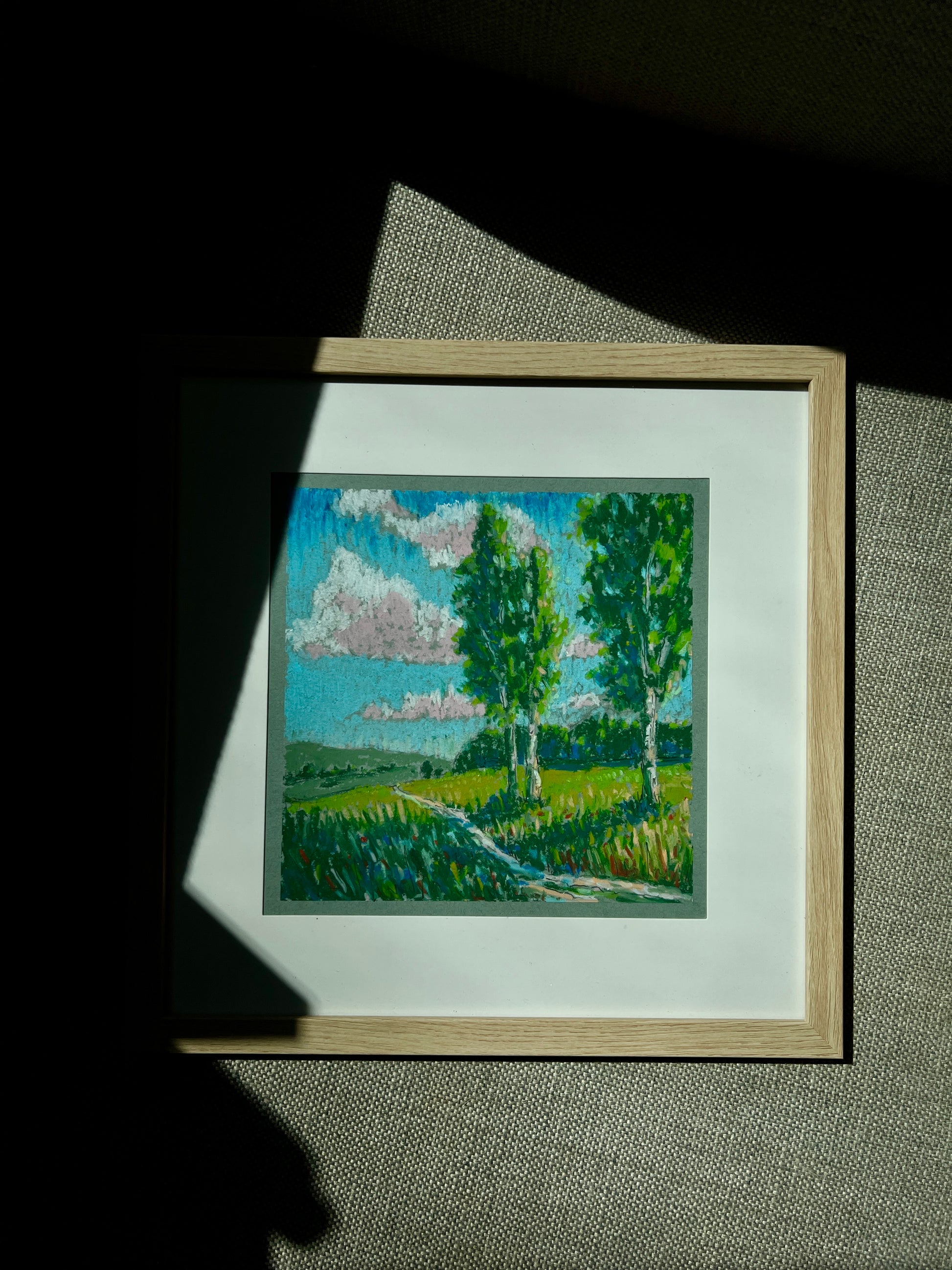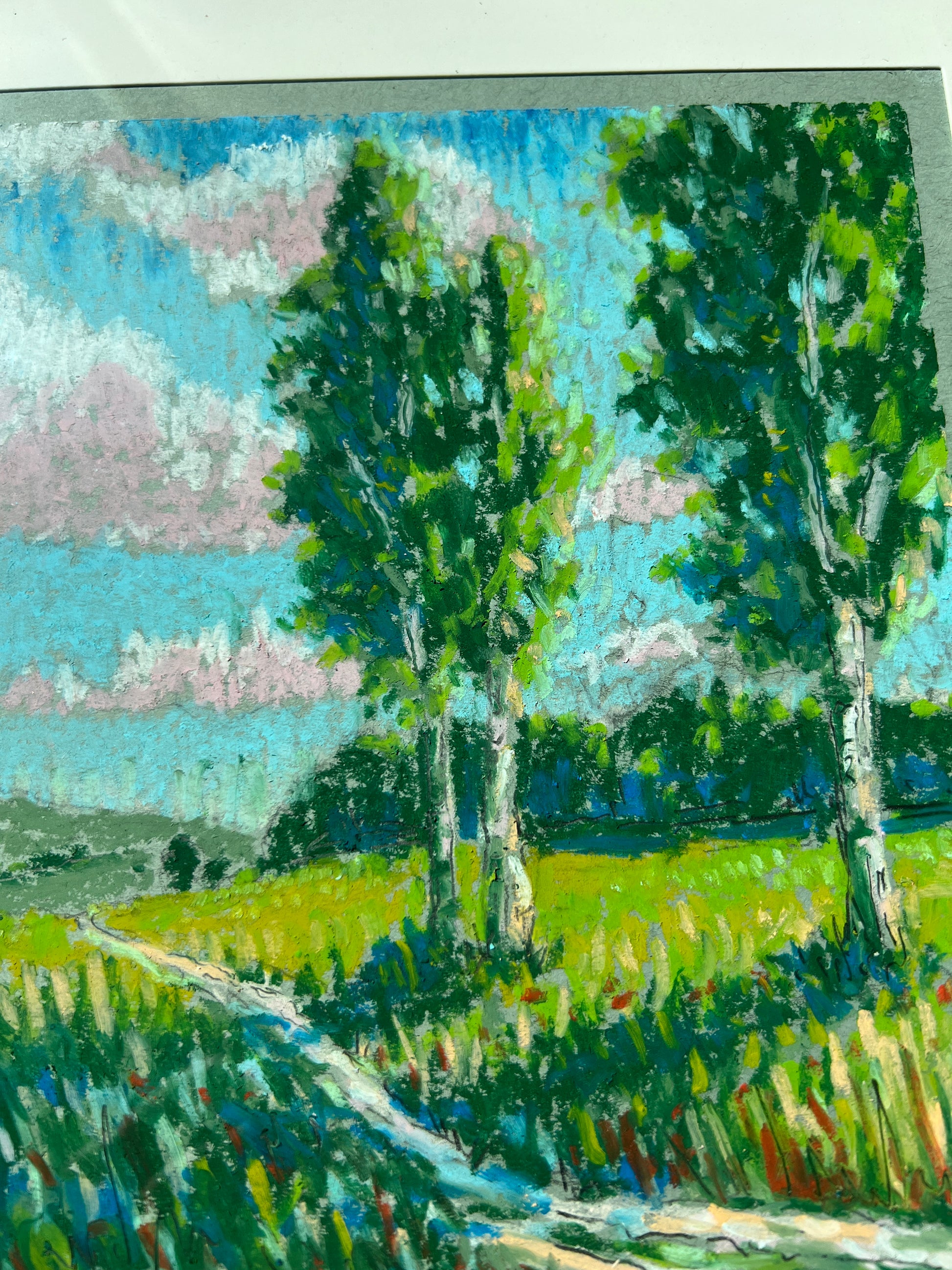 This piece was created with oil pastels on toned paper, where rich, saturated pigment meets the cool, subtle undertones of the surface. The pastels glide on smoothly, allowing for immediate, expressive color that remains vibrant and full of life. To preserve the delicate texture and depth of the work, it comes framed under glass, ready to hang and enjoy.