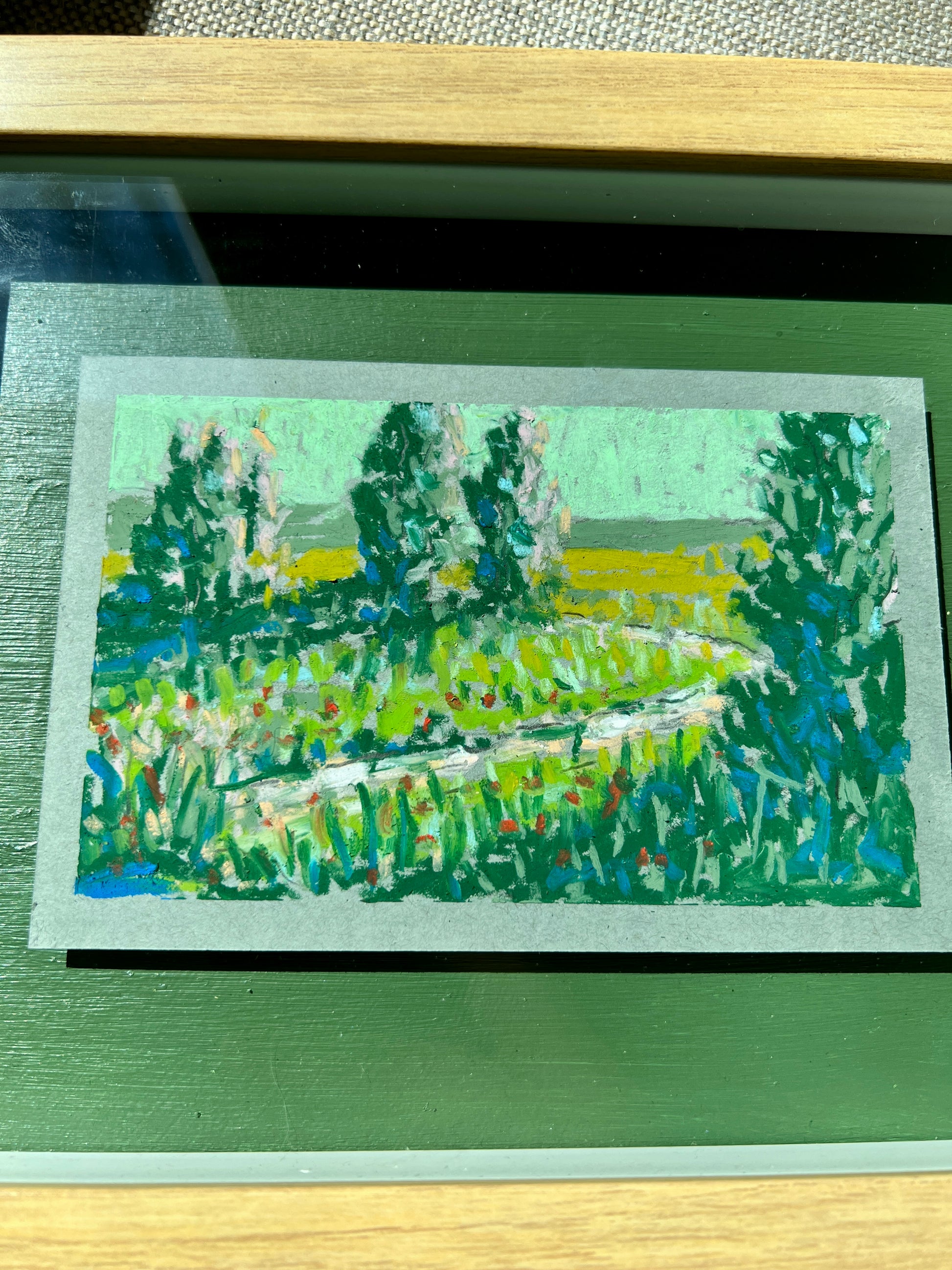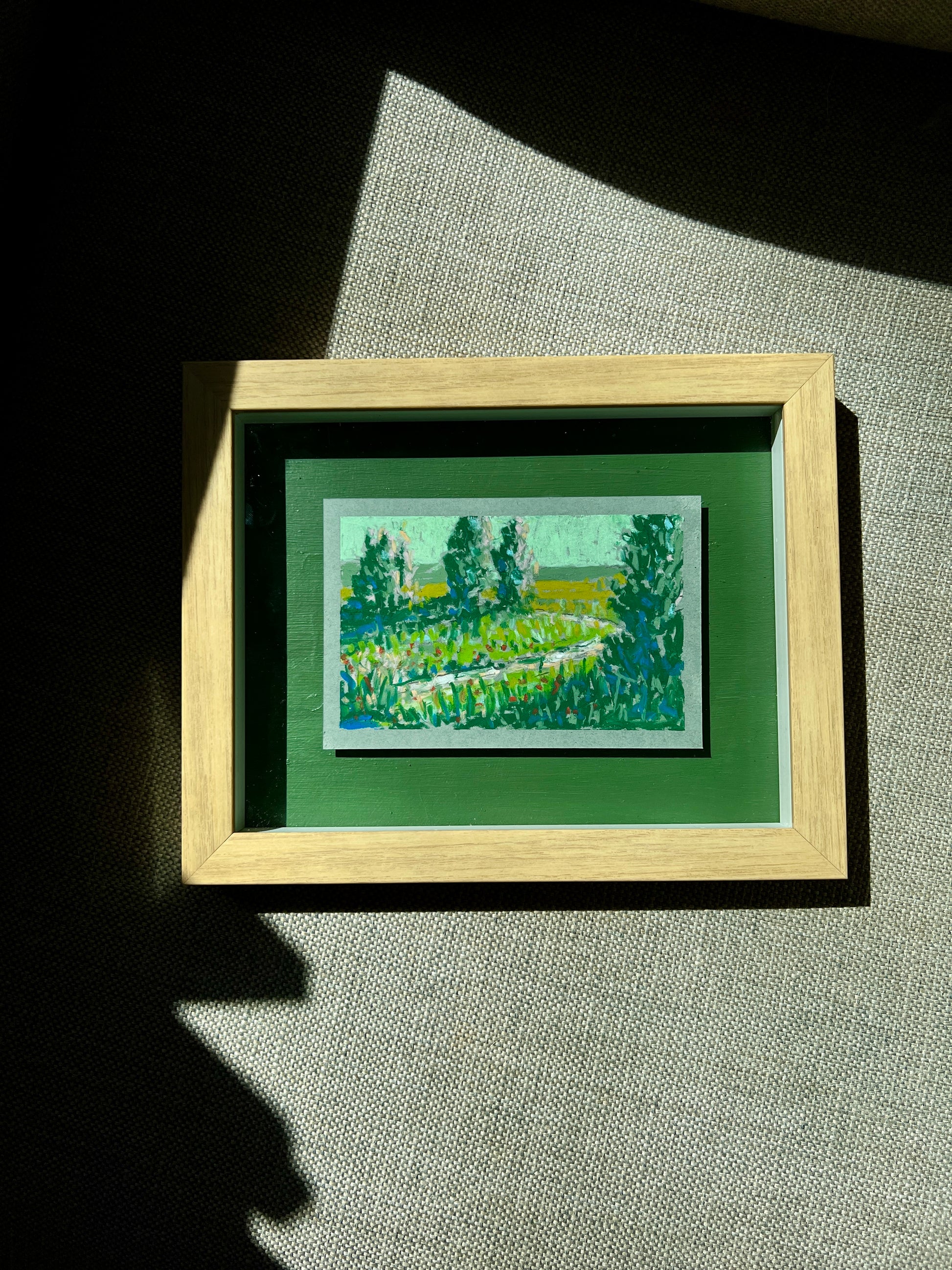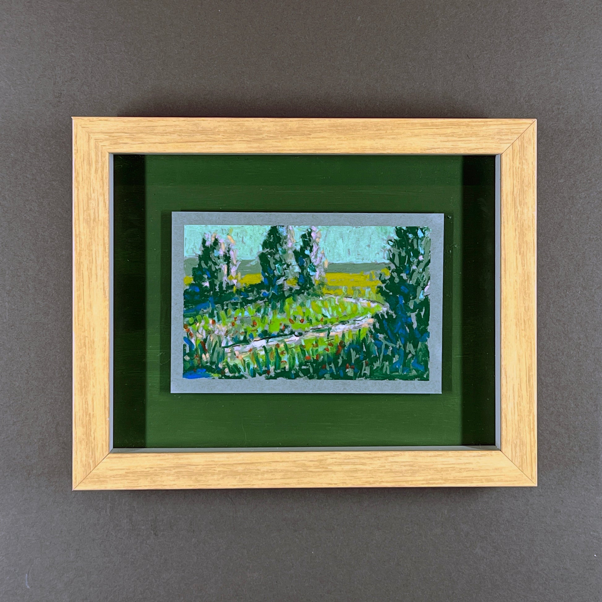 This piece was created with oil pastels on toned paper, where rich, saturated pigment meets the cool, subtle undertones of the surface. The pastels glide on smoothly, allowing for immediate, expressive color that remains vibrant and full of life. To preserve the delicate texture and depth of the work, it comes framed under glass, ready to hang and enjoy.