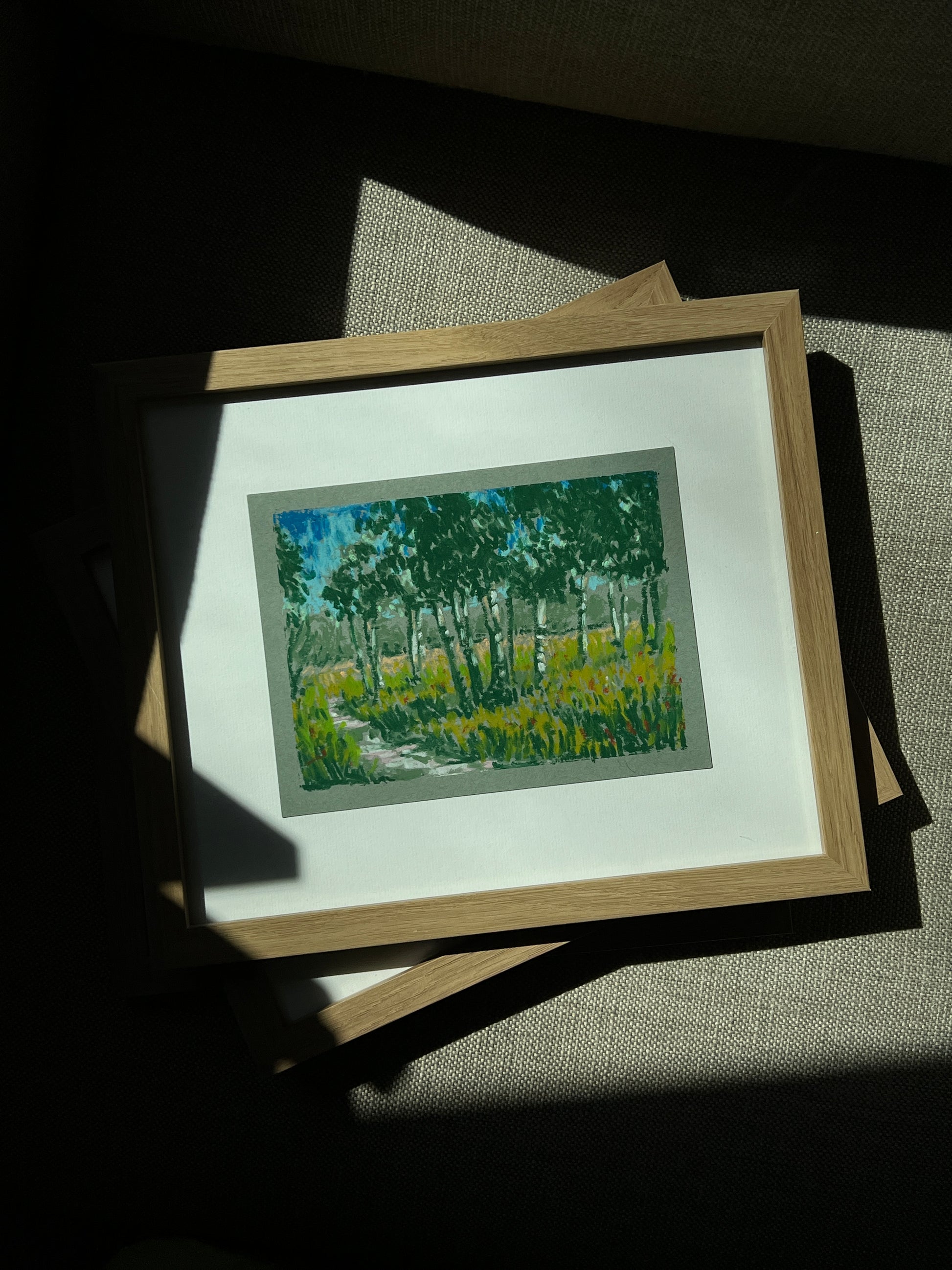 This piece was created with oil pastels on toned paper, where rich, saturated pigment meets the cool, subtle undertones of the surface. The pastels glide on smoothly, allowing for immediate, expressive color that remains vibrant and full of life. To preserve the delicate texture and depth of the work, it comes framed under glass, ready to hang and enjoy.