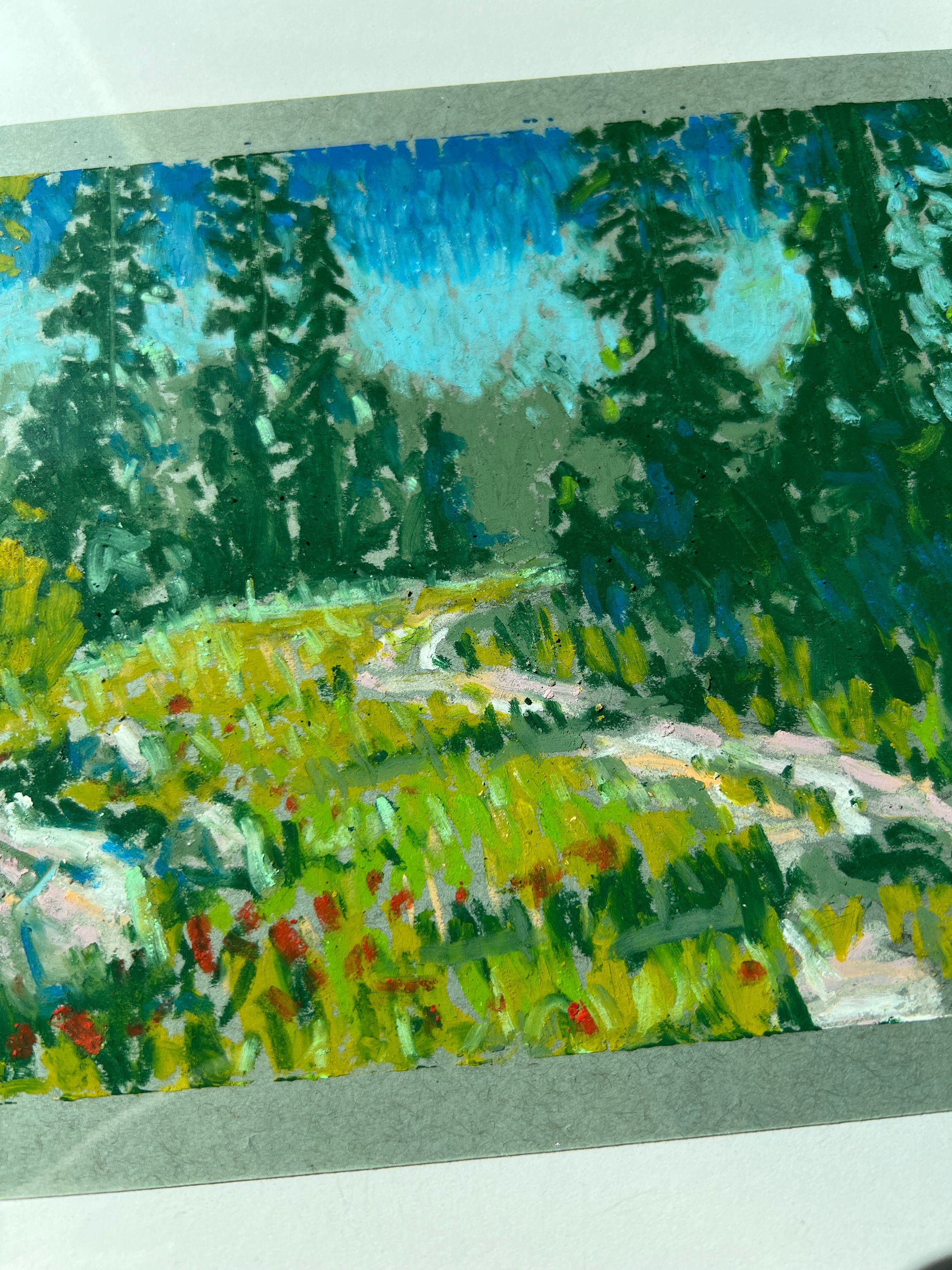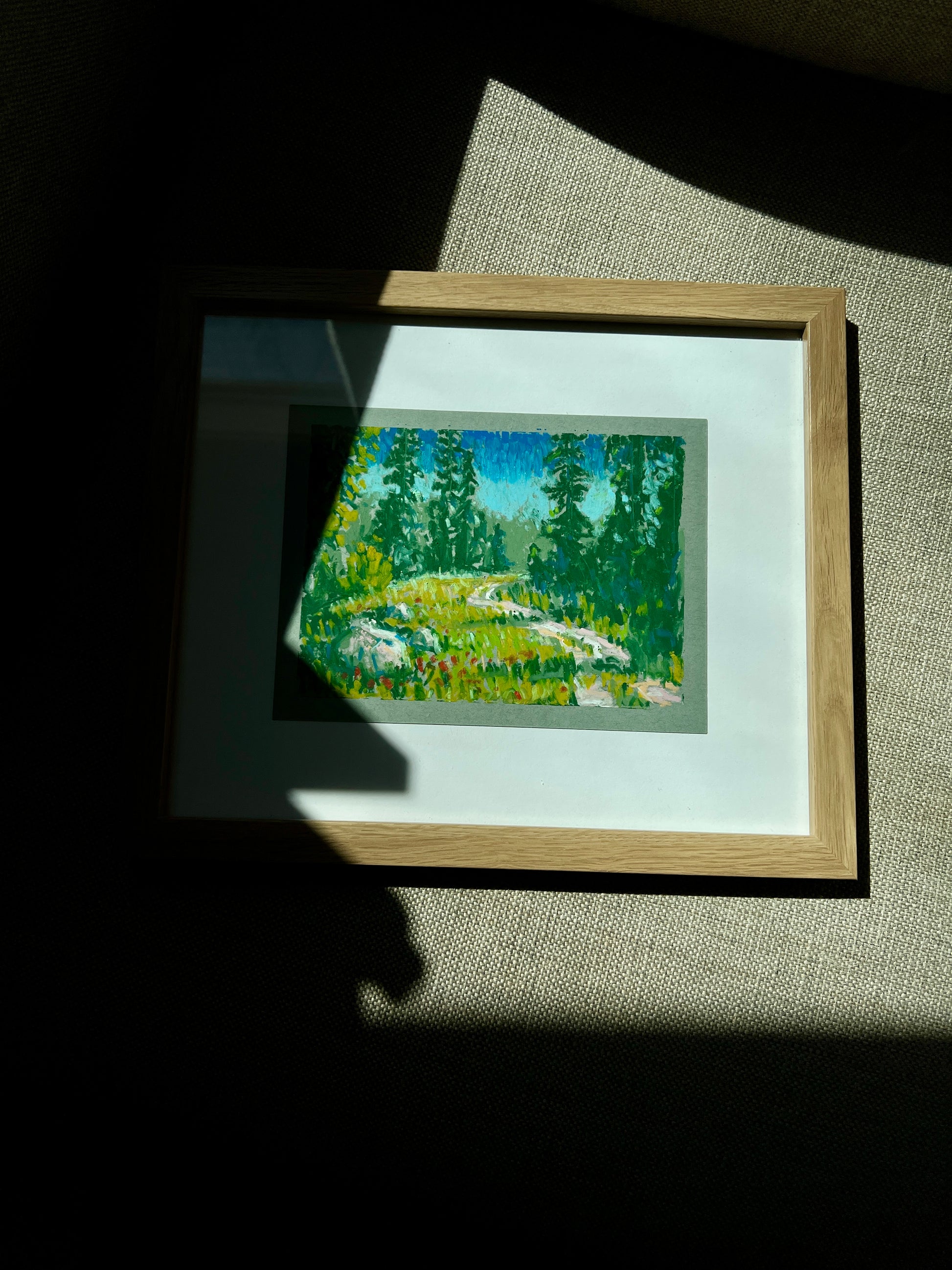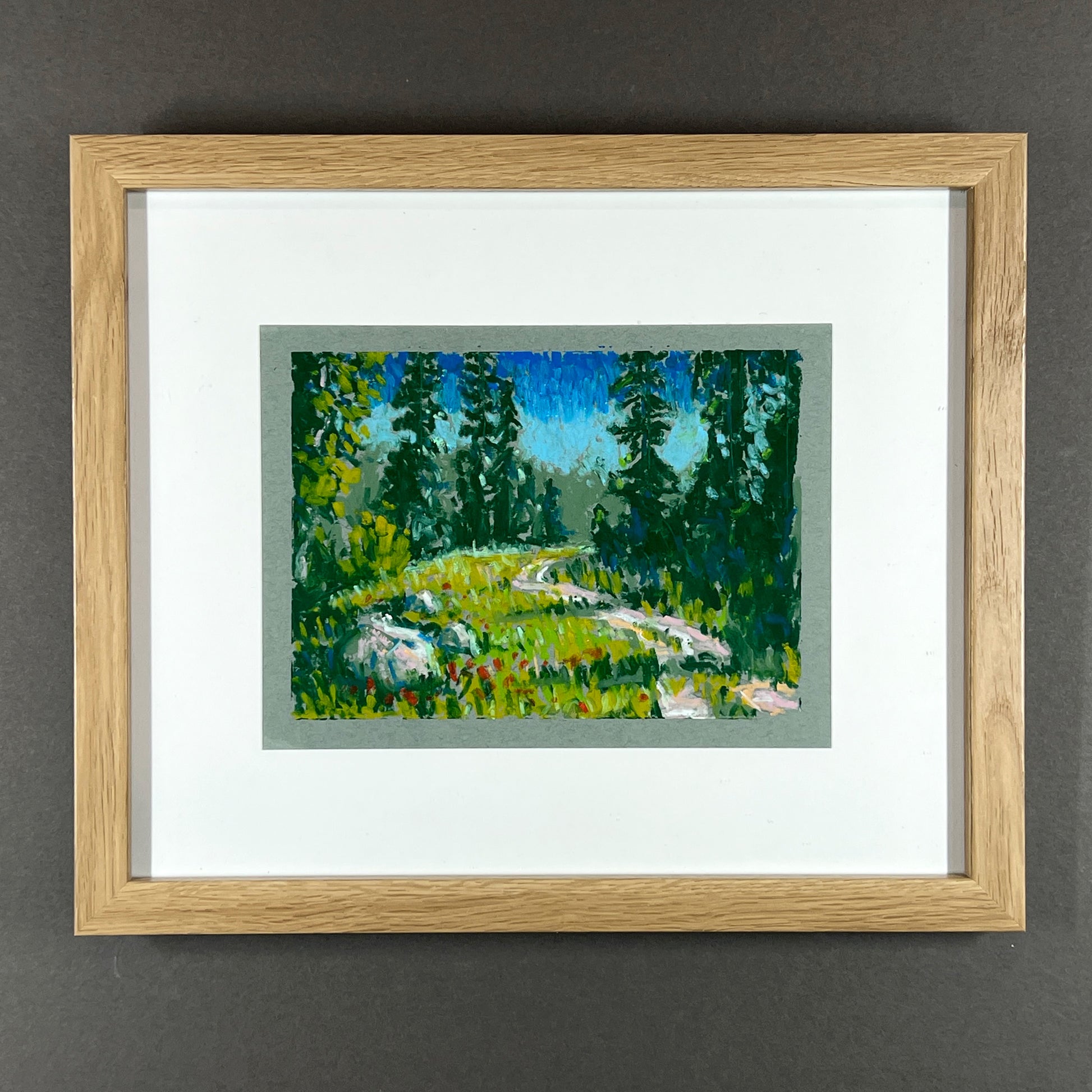 This Peaceful Paths Collection of work is unified not just in subject but in the colors that bring it to life. I have chosen a limited, vibrant palette, intentionally minimizing color mixing to preserve the purity of each hue. Rather than breaking up color fields, I have focused on playing with chromatic values—using the intensity of color itself to create depth, atmosphere, and movement within each landscape.