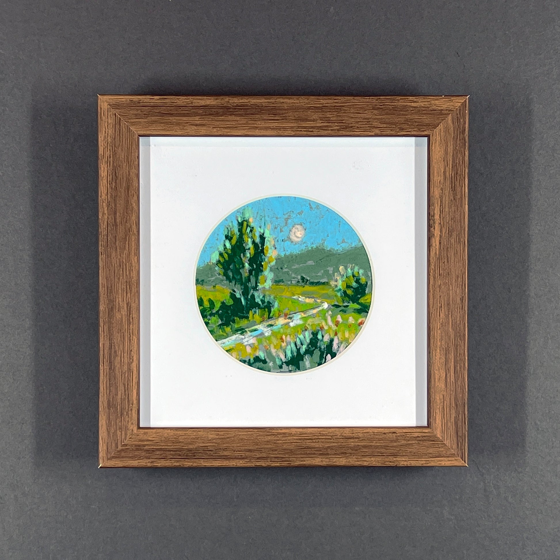 This Peaceful Paths Collection of work is unified not just in subject but in the colors that bring it to life. I have chosen a limited, vibrant palette, intentionally minimizing color mixing to preserve the purity of each hue. Rather than breaking up color fields, I have focused on playing with chromatic values—using the intensity of color itself to create depth, atmosphere, and movement within each landscape.