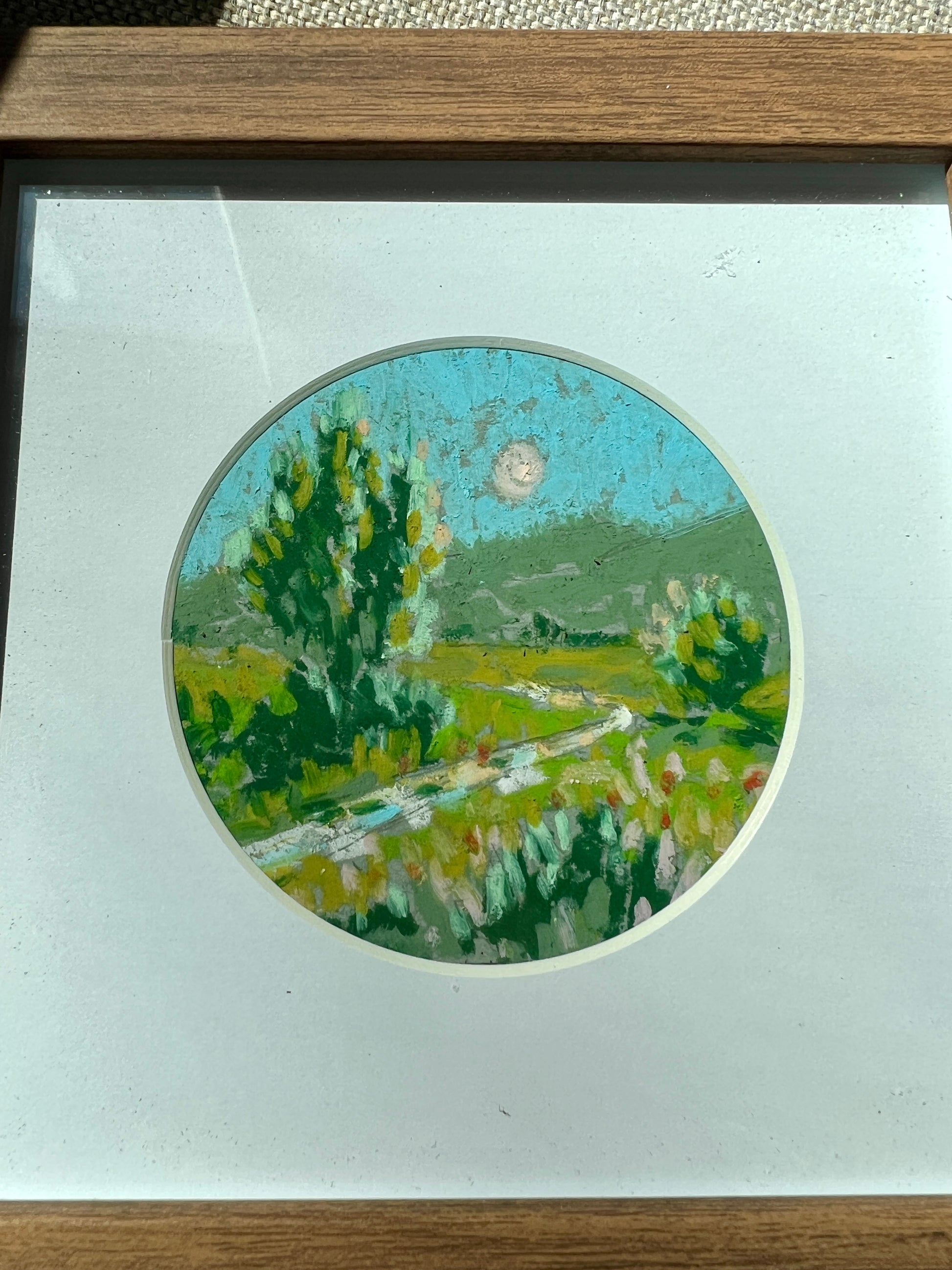 This piece was created with oil pastels on toned paper, where rich, saturated pigment meets the cool, subtle undertones of the surface. The pastels glide on smoothly, allowing for immediate, expressive color that remains vibrant and full of life. To preserve the delicate texture and depth of the work, it comes framed under glass, ready to hang and enjoy.