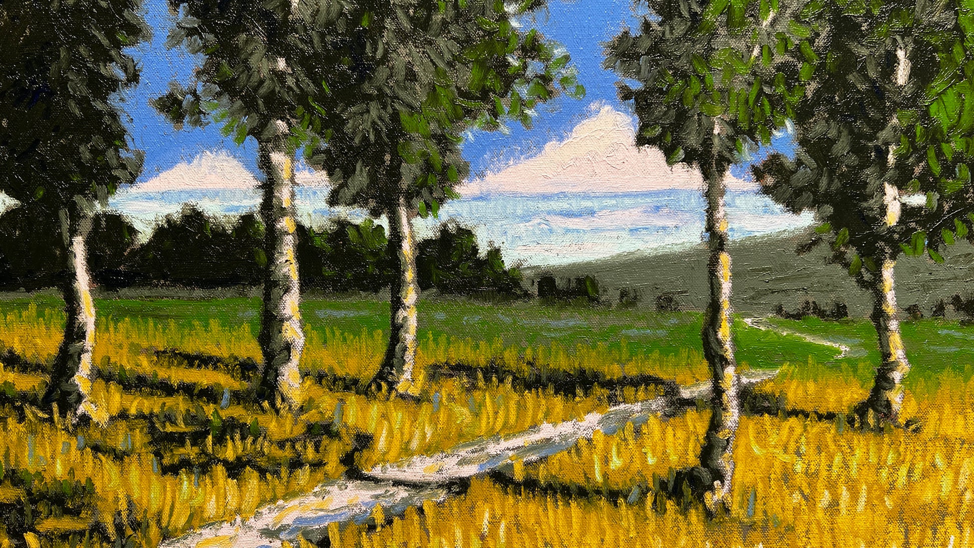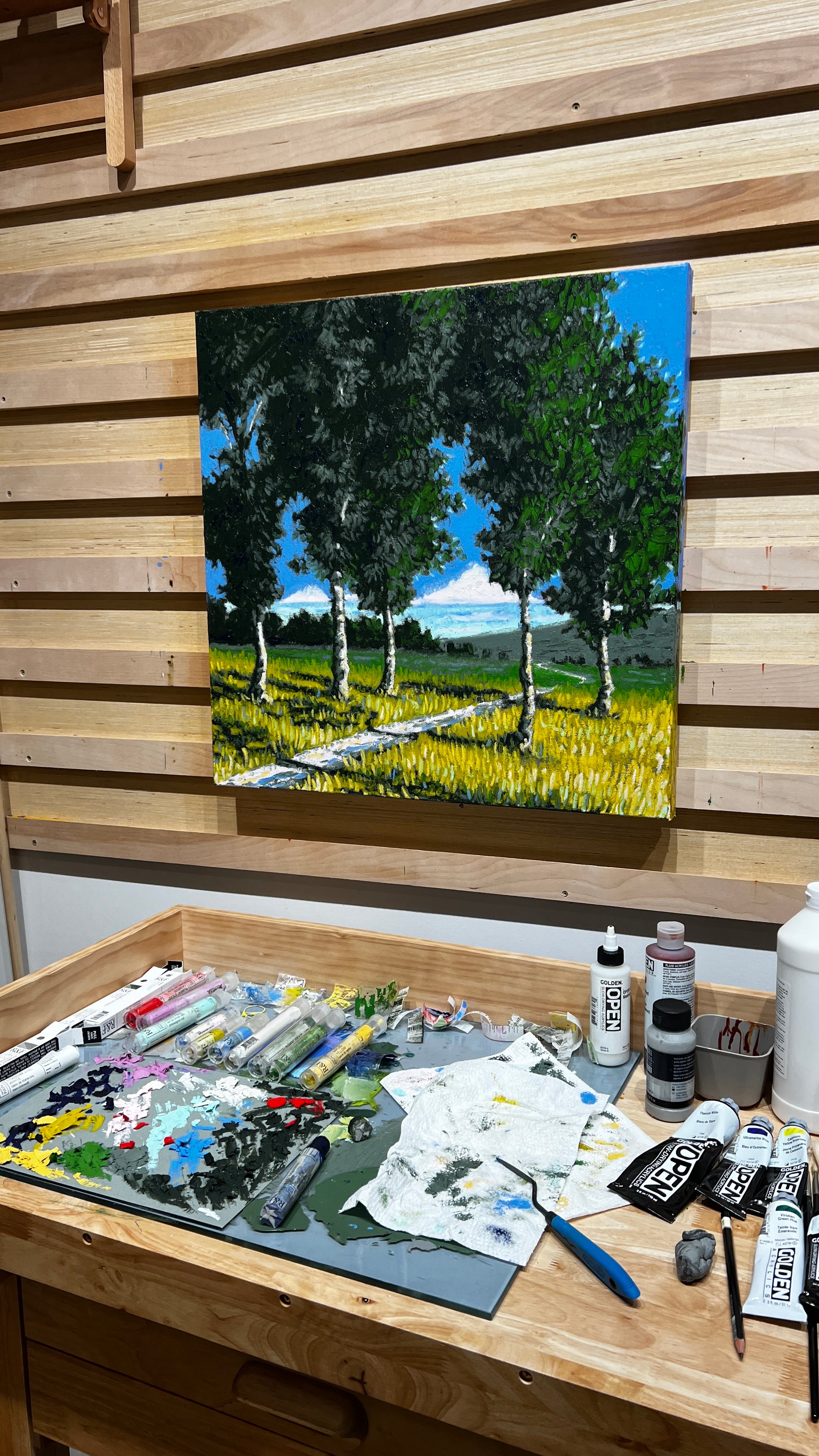This Peaceful Paths Collection of work is unified not just in subject but in the colors that bring it to life. I have chosen a limited, vibrant palette, intentionally minimizing color mixing to preserve the purity of each hue. Rather than breaking up color fields, I have focused on playing with chromatic values—using the intensity of color itself to create depth, atmosphere, and movement within each landscape.